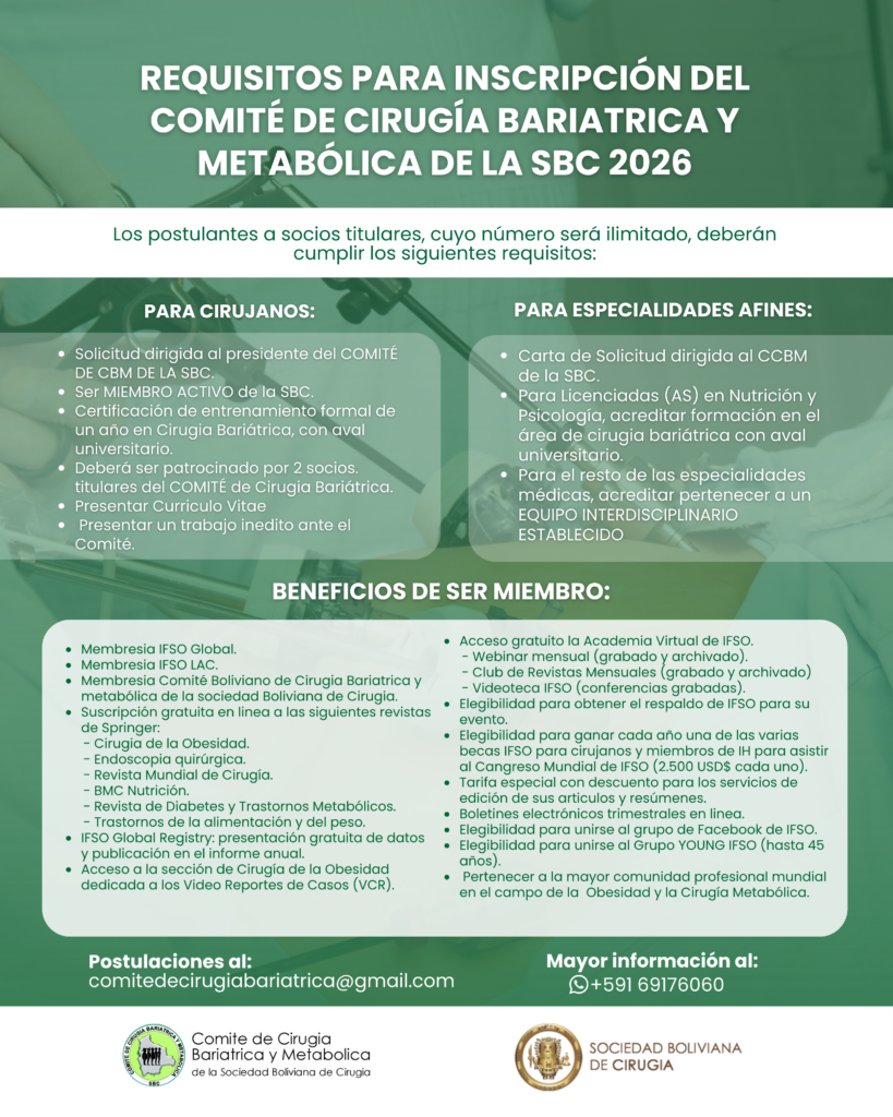 La Sociedad Boliviana de Cirugía ha creado el Comité de Cirugía Bariátrica y metabólica, una entidad sin fines de lucro, con personaería jurídica a través de la Sociedad y capacidad plena de obrar para administrar y disponer de sus bienes, para el cumplimiento de sus fines, entre los cuales están mejorar las diversas técnicas para satisfacer mejor las necesidades de los pacientes.